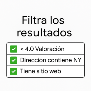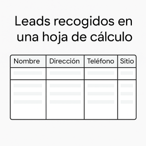 Encuentra y guarda de forma sencilla los leads más relevantes para tu negocio. Solo tienes que elegir el tipo de empresa o sector que te interesa, definir la zona geográfica en la que quieres buscar y establecer el radio de alcance que mejor se adapte a tus necesidades. Nuestro sistema recopila y organiza los resultados de manera automática, entregándotelos directamente en tu hoja de cálculo. Así, podrás revisarlos, filtrarlos según tus propios criterios y tomar decisiones de inmediato. De esta manera, ahorrarás tiempo en la prospección, tendrás información actualizada y podrás convertir más oportunidades en clientes reales.